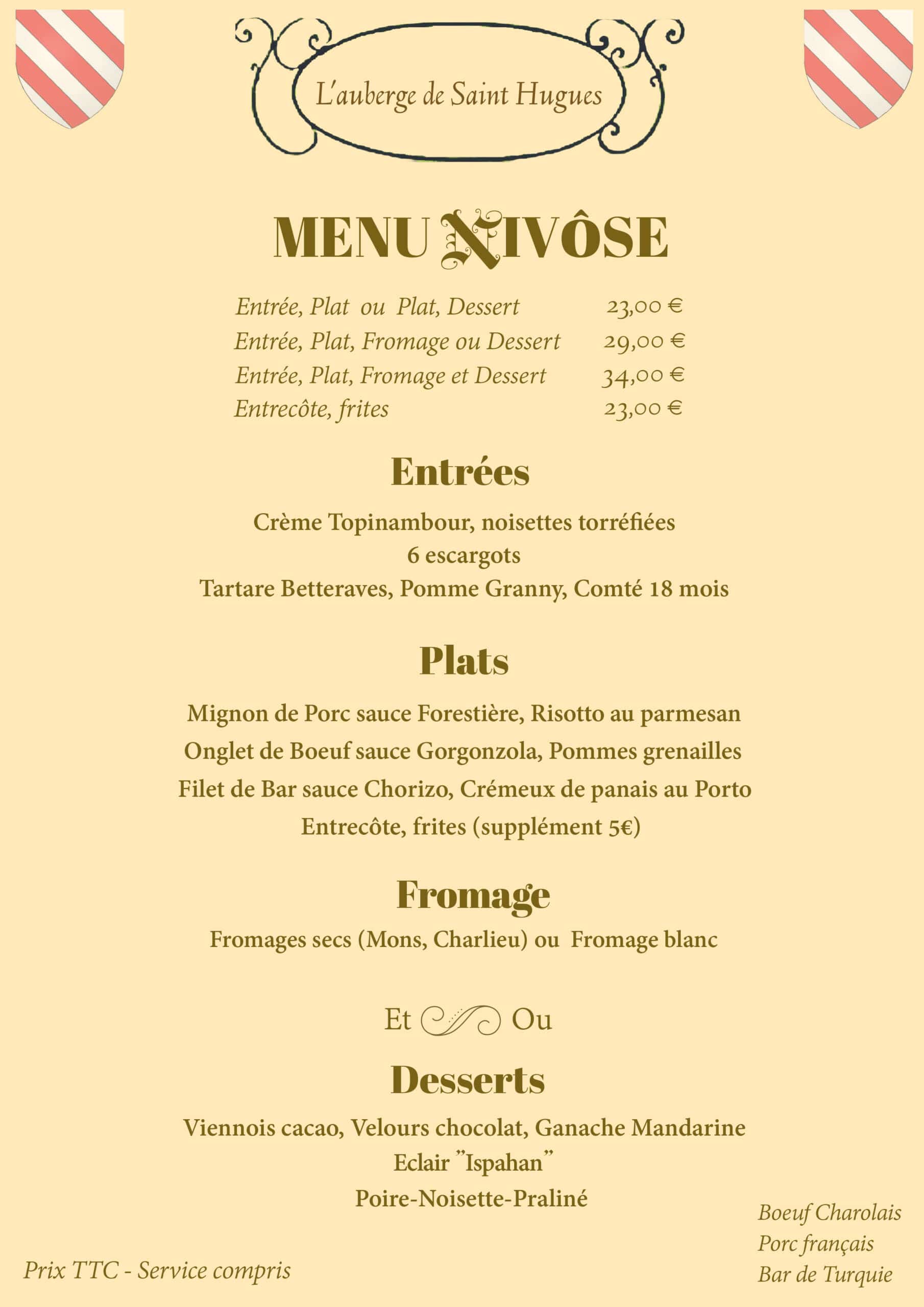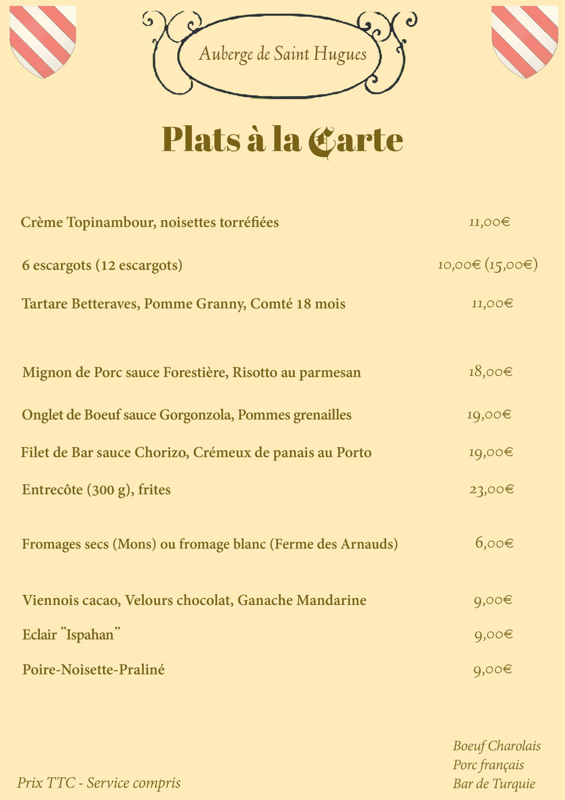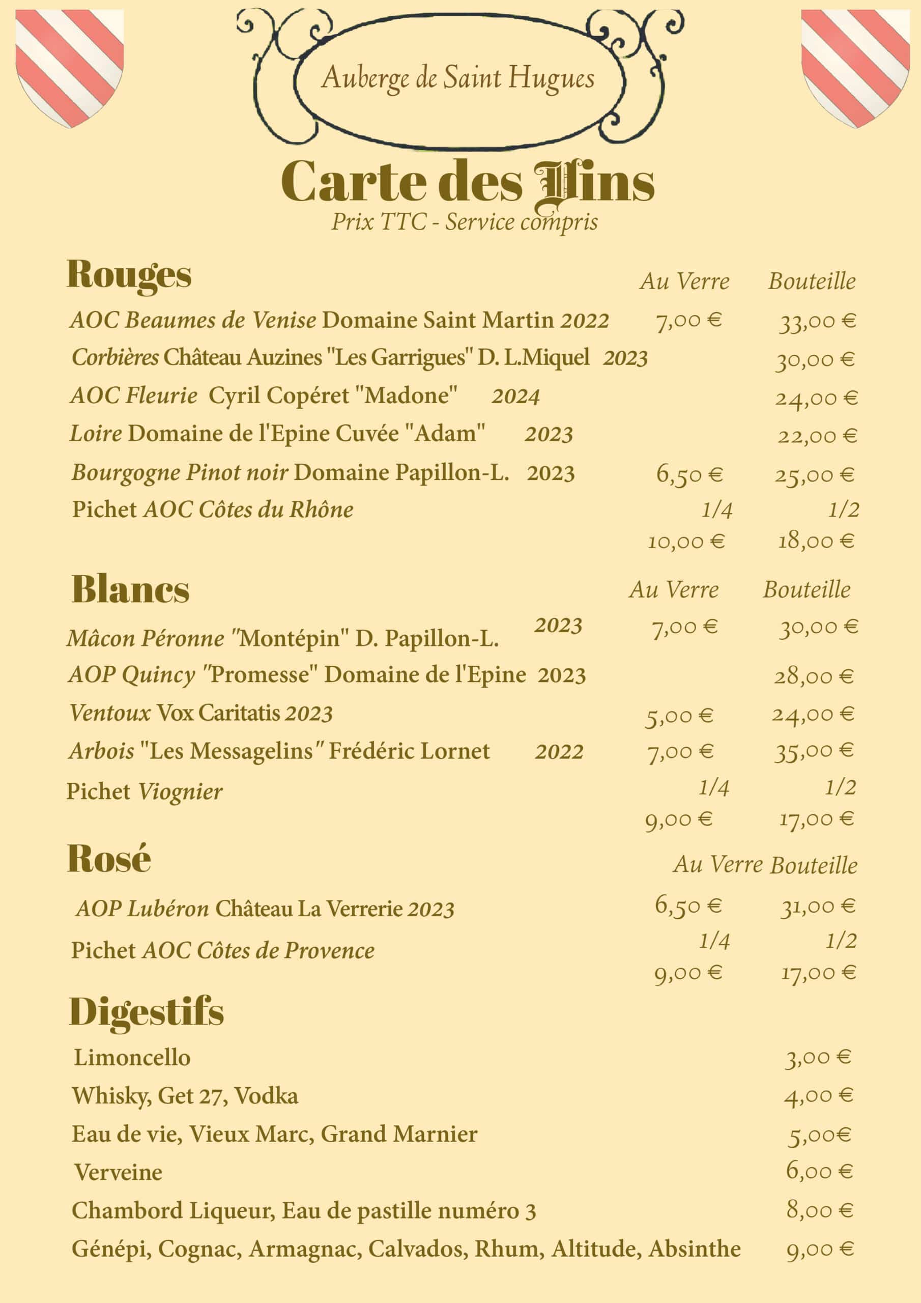 Publié sur Alice Paire01/12/2025Trustindex vérifie que la source originale de l'avis est Google. Nous avons découvert une délicieuse cuisine de l’entrée au dessert ! Les plats proposés étaient copieux et savoureux avec un jolie choix varié, nous avons été ravis ! Cependant, nous avons été déçus du service.. Un enchaînement rapide, une musique coupée à la fin du repas (peut-être un signe pour que l’ont parte..). Après plusieurs minutes, assiette vide, toujours pas de serveuse même si une envie de digestif était là.. Nous avons donc décidé de partir.. La serveuse n’avait pas l’air étonnée de ne pas nous avoir proposé ni café ni digestif. C’est bien dommage ! Et pour finir, pas de « s’il vous plaît » au moment de l’annonce du montant de la note. Ce n’était peut-être pas son jour.. Mais cela ne doit pas se faire ressentir sur le client.. Malgré tout, cela ne nous empêchera pas de revenir pour la très bonne cuisine !Publié sur Élise Renaux23/11/2025Trustindex vérifie que la source originale de l'avis est Google. SucculentPublié sur Jeanine MOREAU01/11/2025Trustindex vérifie que la source originale de l'avis est Google. Découverte de cette auberge...Une totale réussite..le cadre sobre mais élégant , l'accueil et le service professionnell..et une cuisine qui ravit aussi bien les yeux que les papilles .Tout était parfait de l'entrée au dessert. Félicitations au Chef.Publié sur jean-francois Clement01/11/2025Trustindex vérifie que la source originale de l'avis est Google. Beau cadre malgré le temps ...bon repas mais service un peu rapidePublié sur Betty Baaziz27/10/2025Trustindex vérifie que la source originale de l'avis est Google. Une cuisine goûteuse et raffinée, un service au top, un restaurateur soucieux du bien-être de ses clients, j’ai aaaaddddoooorrré!!! Je recommande cette auberge du terroir français au cœur d’un splendide village médiéval.Publié sur Servane Ledon Thibierge22/10/2025Trustindex vérifie que la source originale de l'avis est Google. Nous avons passé une excellente soirée, cadre chaleureux, et menu aussi original que délicieux, nous reviendrons sans hésiter, bravo au chef ! 👍👍👍Publié sur Dominique Fenin12/10/2025Trustindex vérifie que la source originale de l'avis est Google. Super auberge 🙏Cuisinier et serveuse sympathiques et valeureux👍 Cadre magnifique , cuisine au top.👏Publié sur Ness Glz30/09/2025Trustindex vérifie que la source originale de l'avis est Google. Très bonne expérience dans ce restaurant. Serveuse souriante et très réactive, la cuisine y est délicieuse.